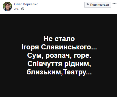 "Не стало Игоря Славинского ... Печаль, отчаяние, горе. Соболезнования родным, близким, Театру", - говорится в сообщении.