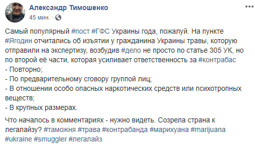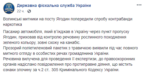 Самый популярный пост ГФС Украины года, пожалуй. На пункте Ягодин отчитались об изъятии у гражданина Украины травы, которую отправили на экспертизу, возбудив дело не просто по статье 305 УК, но по второй её части, которая усиливает ответственность за контрабас