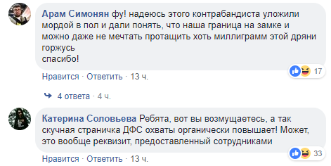 "Фу! надеюсь этого контрабандиста уложили мордой в пол и дали понять, что наша граница на замке и можно даже не мечтать протащить хоть миллиграмм этой дряни. Горжусь. Спасибо!"