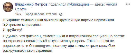 "В Украине таможенники выявили крупнейшую партию наркотиков! 0,2 грамма марихуаны. И трубочку! Я думаю, что фискалы, таможенники и пограничники специально постят на страницах своих служб такую смешную ересь. Такое нельзя не перепостить, тебепи@чмо, поэтому они таким хитрым способом раскручивают свои страницы".