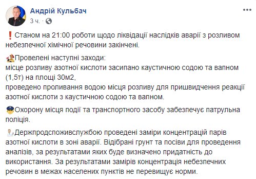 По состоянию на 21:00 работы по ликвидации последствий аварии с разливом азотной кислоты в Днепропетровской области закончены. Об этом сообщил в Facebook начальник ГУ ГСЧС области Андрей Кульбач.