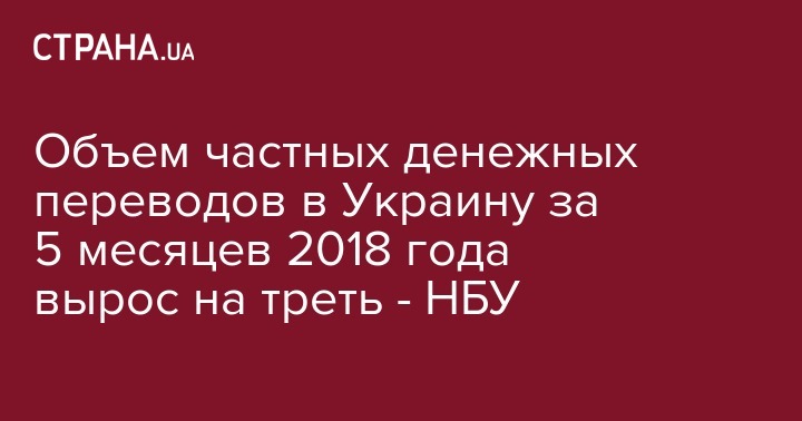 Объем частных денежных переводов в Украину в январе-мае 2018 года вырос на 30% по сравнению с соответствующим периодом 2017 года – до $4,5 млрд, сообщил глава Совета Национального банка Украины (НБУ) Богдан Данилишин.