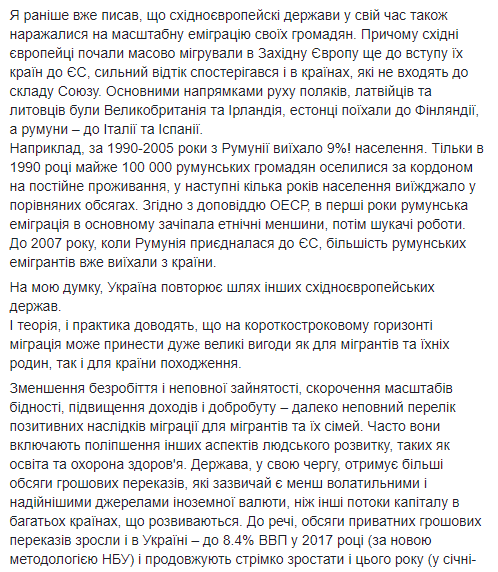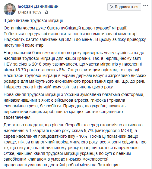 "В инфляционном отчете НБУ за январь 2018 года отмечалось, что доля мигрантов в населении в возрасте 15-70 лет составляет 8%... Масштабы трудовой миграции в Украине приобрели угрожающе высоких размеров для будущего экономического процветания страны", - написал Б.Данилишин.