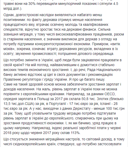 "К примеру, "утечка мозгов", в частности, означает: потерю государственных ресурсов, вложенных в их образование; сужение промышленности; ухудшение деловой среды", - пишет глава Совета НБУ.