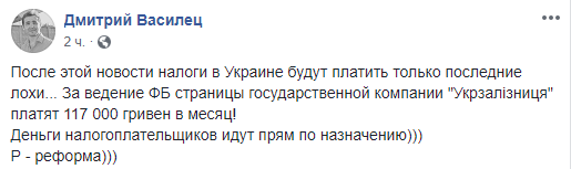 "После этого налоги будут платить только последние лохи". В Facebook обсуждают космическую сумму раскрутки страницы Укрзализныци