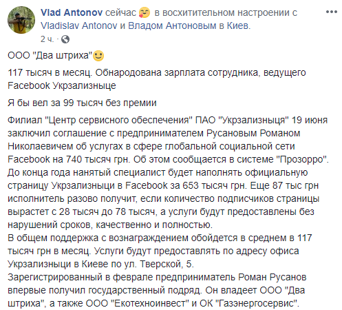Обсуждают в Facebook и название одной из компаний, который владеет предприниматель, выигравший тендер - ООО "Два штриха".
