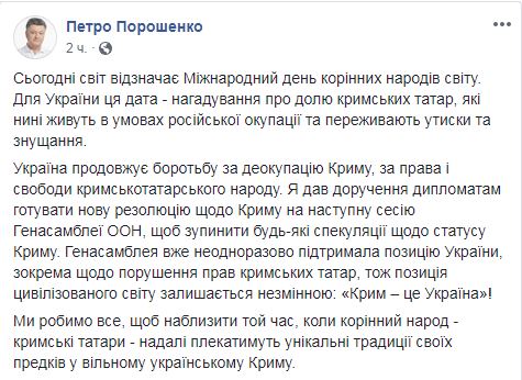 "Генассамблея уже неоднократно поддержала позицию Украины, в частности относительно нарушения прав крымских татар, поэтому позиция цивилизованного мира остается неизменной: "Крым - это Украина", - добавил президент. - Мы делаем все, чтобы приблизить то время, когда коренной народ - крымские татары - дальше будут лелеять уникальные традиции своих предков в свободном украинском Крыму", - заверил он.