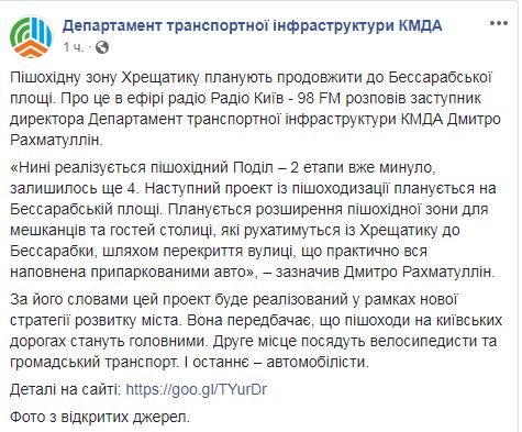 "Сейчас реализуется пешеходный Подол - два этапа прошло, осталось еще четыре. Следующий проект планируется на Бессарабской площади. Планируется расширение пешеходной зоны для жителей и гостей столицы, которые будут двигаться с Крещатика до Бессарабки, путем перекрытия улицы, которая практически вся заполнена припаркованными авто", - рассказал Рахматуллин.