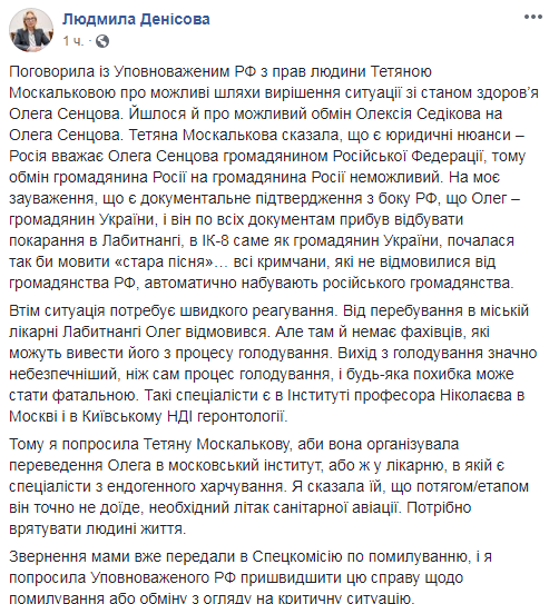 "Впрочем, ситуация требует быстрого реагирования. От пребывания в городской больнице Лабытнанги Олег отказался. Но там нет специалистов, которые могут вывести его из процесса голодания. Выход из голодания значительно опаснее, чем сам процесс голодания, и любая погрешность может стать роковой. Такие специалисты есть в Институте профессора Николаева в Москве и в Киевском НИИ геронтологии. Поэтому я попросила Татьяну Москалькову, чтобы она организовала перевод Олега в московский институт, или же в больницу, в которой есть специалисты по эндогенному питанию. Я сказала ей, что поездом/этапом он точно не доедет, необходим самолет санитарной авиации. Нужно спасти человеку жизнь", - заявила украинский омбудсмен.