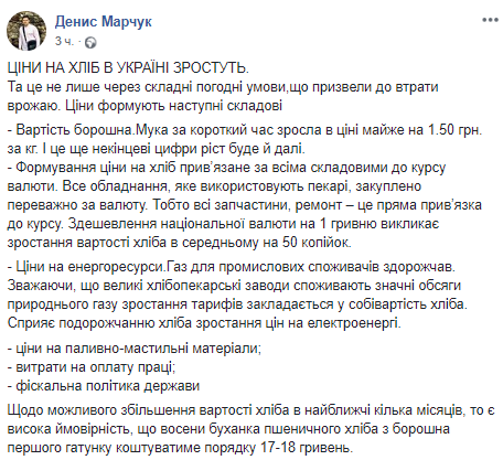 "Относительно возможного увеличения стоимости хлеба в ближайшие несколько месяцев, то высока вероятность, что осенью буханка пшеничного хлеба из муки первого сорта будет стоить порядка 17-18 гривен", - написал он.