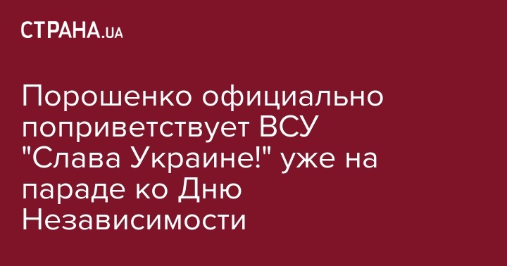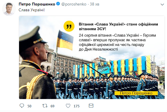 По словам Порошенко, слова "Слава Украине! Героям слава!" станут официальным приветствием Вооруженных сил уже в этом году. Такое приветствие должно прозвучать на параде по случаю Дня независимости 24 августа.