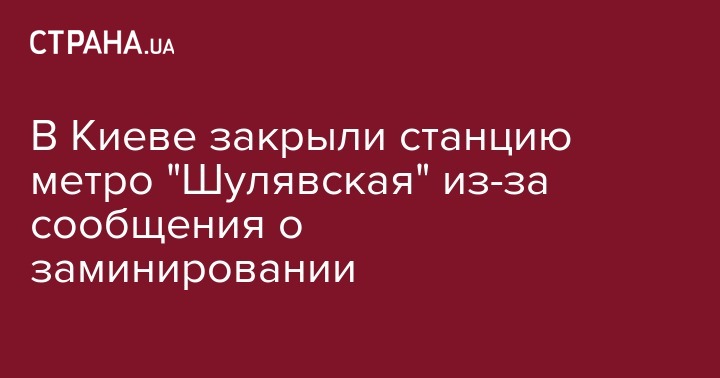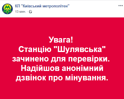 "Станция "Шулявская" закрыта для проверки. Поступил анонимный звонок о минировании", - говорится в сообщении метрополитена.