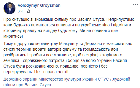 "Недопустимо, когда всякий пытается влиять на украинское кино и подменять историческую правду на выгодную любому. Мы не должны с этим мириться! Поэтому я поручаю руководству Минкульта и Госкино в максимально сжатые сроки собрать авторов фильма и общественность, чтобы разобраться и сделать все возможное, чтобы в ленте история моего земляка - настоящего патриота и борца за свободу Украины Василия Стуса была рассказана честно, правдиво, полностью и без искажений", - написал Гройсман.