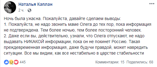 "Даже если вы действительно узнали, что Олега отпускают, не надо выдавать никакой информации, пока он не покинет Россию. Такая преждевременная информация, даже будучи правдой, может навредить ситуации. Все мы видим, как все нестабильно в царстве стабильности", - указано в опубликованном сообщении на ее странице в Facebook.