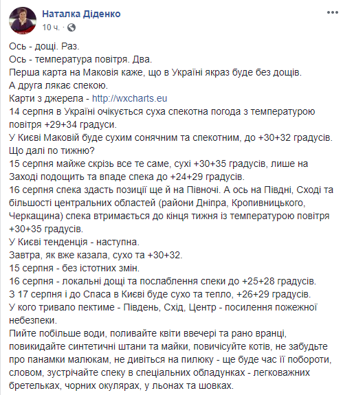 16 августа жара сдаст позиции еще и на Севере. А вот на Юге, Востоке и большинстве центральных областей (районы Днепра, Кропивницкого, Черкасской области) жара удержится до конца недели с температурой воздуха + 30... + 35 градусов", - написала она.