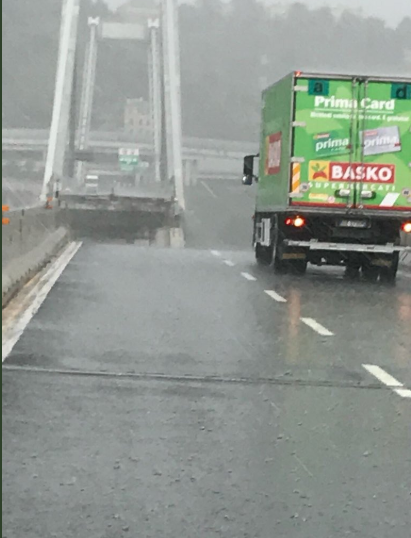 Одна из машин чудом удержалась на краю. Мост обвалился в 20 метрах от нее. Водитель по имени Риччи. который находился за рулем грузовика, рассказал, что находится под сильными впечатлениями.