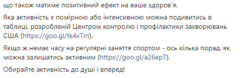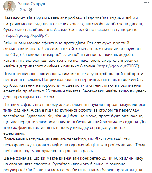 В мире 9% людей умирают преждевременно из-за малоподвижного образа жизни. Об этом сообщила исполняющая обязанности министра здравоохранения Ульяна Супрун на своей странице в соцсети Facebook.