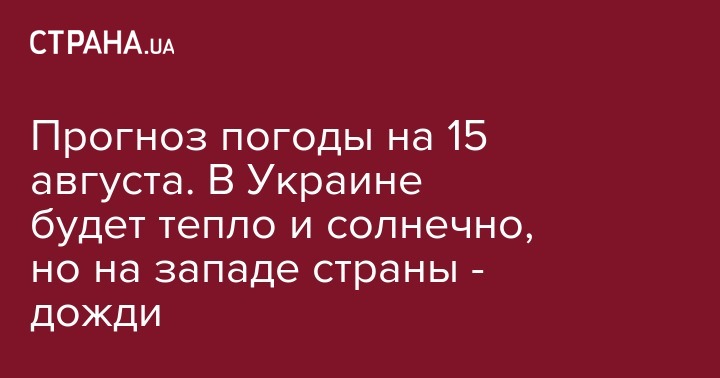В среду, 15 августа в Украине, кроме западного региона, ожидается теплая летняя погода без осадков. Температура от +23 ранним утром до +33 днем.