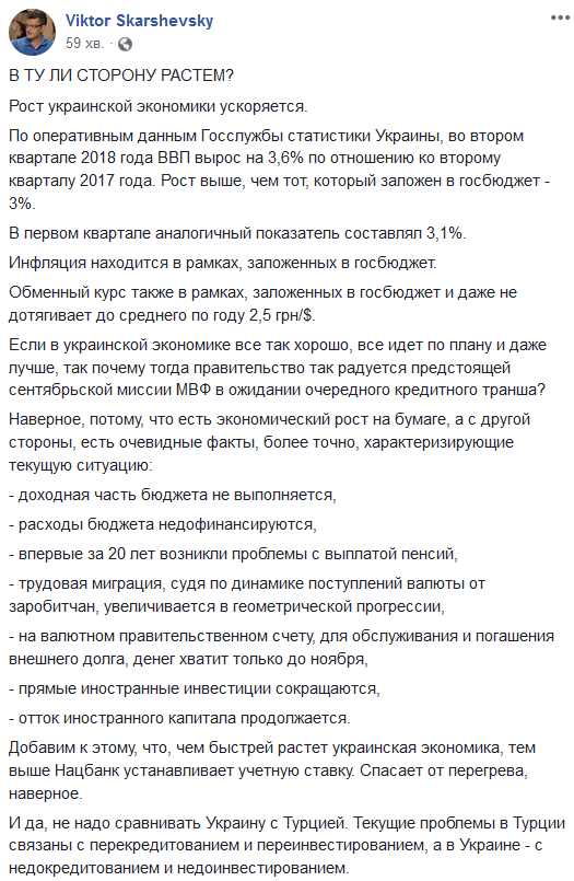 "По оперативным данным Госслужбы статистики Украины, во втором квартале 2018 года ВВП вырос на 3,6% по отношению ко второму кварталу 2017 года. Рост выше, чем тот, который заложен в госбюджет - 3%, - пишет экономист Виктор Скаршевский. - В первом квартале аналогичный показатель составлял 3,1%. Инфляция находится в рамках, заложенных в госбюджет.