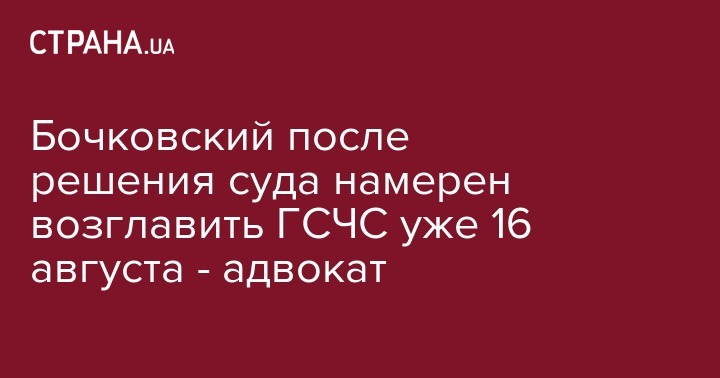Экс-глава Государственной службы по чрезвычайным ситуациям Сергей Бочковский, после восстановления судом в должности, намерен предпринять попытку занять свое рабочее место 16-17 августа. Об этом сказал адвокат Бочковского Владимир Енич, пишут "Украинские новости".