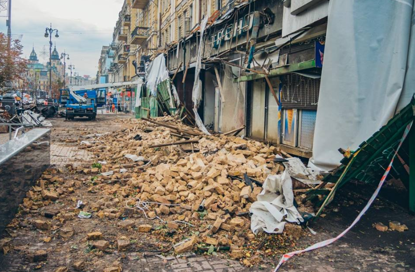 После ливня на Крещатике обвалилось здание старого гастронома, которое ранее едва уцелело при пожаре.