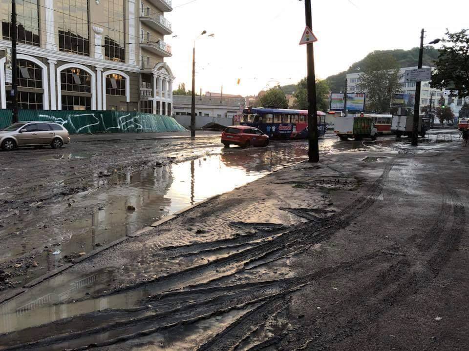 После ночной бури в Киеве, которая сопровождалась градом и сильным ветром, дороги оказались заваленными мусором и затопленными грязью. В то время, как на Крещатике из ливневок доставали ветки и листья и убирали горы мусора, на Подоле автомобилям и пешеходам пришлось пробираться в грязи, которая толстым слоем покрыла дорогу после того, как с асфальта схлынули реки.