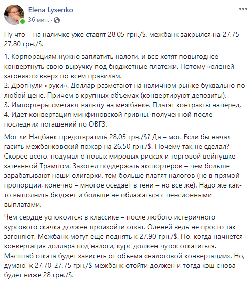"Скорее всего, подумал о новых мировых рисках и торговой войнушке затеянной Трампом. Захотел поддержать экспортеров – чем больше зарабатывают наши олигархи, тем больше платят налогов (не в прямой пропорции, конечно – многое оседает в тени – но все же). Надо же как-то выполнить бюджет и больше не облажаться с пенсионными выплатами", -написала Лысенко.