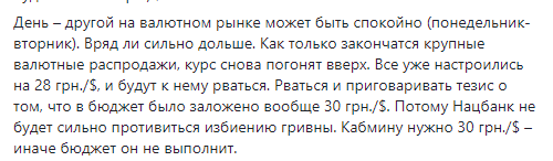 "После любого истеричного курсового скачка должен произойти откат. Оленей ведь не просто так загоняют. Межбанк могут еще поднять к 27,90 грн./$. Но, когда начнется конвертация доллара под налоги, курс должен чуток откатиться. Масштаб отката будет зависеть от объема "налоговой конвертации". Но, думаю, к 27,70-27,75 грн./$ межбанк отойти должен и тогда кэш снова будет ниже 28 грн./$. День - другой на валютном рынке может быть спокойно (понедельник-вторник). Вряд ли сильно дольше. Как только закончатся крупные валютные распродажи, курс снова погонят вверх. Все уже настроились на 28 грн./$, и будут к нему рваться. Рваться и приговаривать тезис о том, что в бюджет было заложено вообще 30 грн./$. Потому Нацбанк не будет сильно противиться избиению гривны. Кабмину нужно 30 грн./$ – иначе бюджет он не выполнит", - написала она.