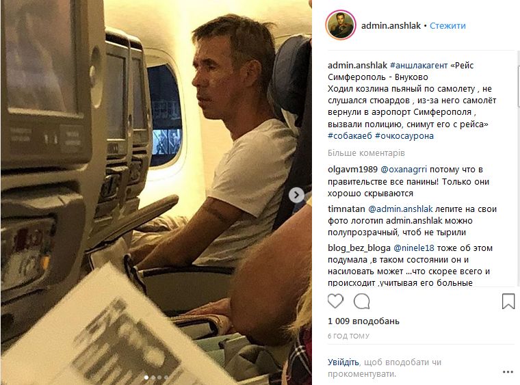 "Ходил козлина пьяный, по самолету , не слушался стюардов , из-за него самолет вернули в аэропорт Симферополя, вызвали полицию, снимут его с рейса", - написал пользователь.