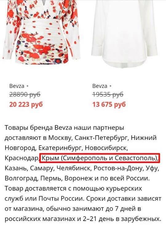 Журналист Александр Дубинский позвонил в интернет-магазин Farfetch, с которым у жены министра инфраструктуры Украины Владимира Омеляна Светланы Бевзы заключен контракт. Там ему подтвердили, что российский магазин доставляет ее одежду как в Россию, так и на территорию оккупированного Крыма. Об этом он написал на своей странице в Facebook.