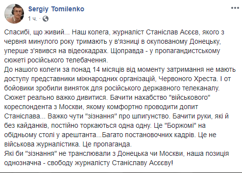 "Спасибо, что живой ... Наш коллега, журналист Станислав Асеев, которого с июня прошлого года держат в тюрьме в оккупированном Донецке, впервые появился на видеокадрах. Правда - в пропагандистском сюжете российского телевидения. К нашему коллеге по более 14 месяцев с момента задержания не имеют доступа представители международных организаций, Красного Креста", - сказано в сообщении.