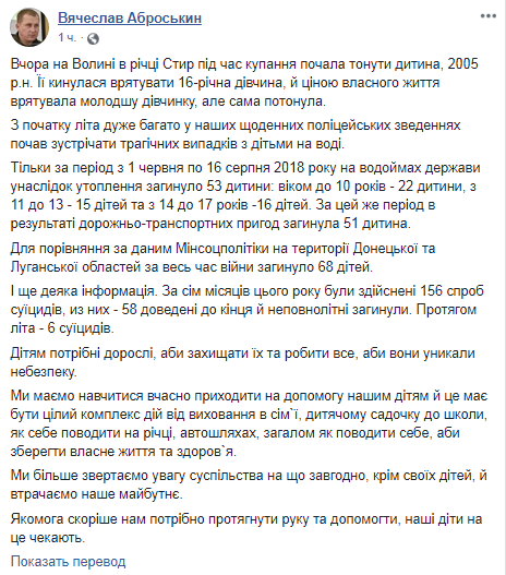 Только летом 2018 года в Украине с собой покончило 6 детей. Об этом на своей странице в Facebook написал первый заместитель председателя Национальной полиции Украины Вячеслав Аброськин.