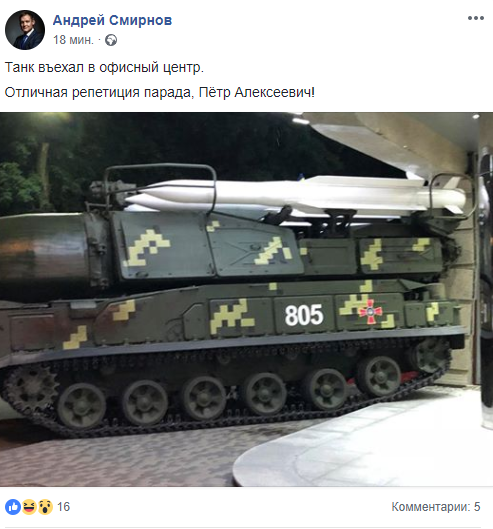 Сегодня, 18 августа, в Киеве самоходная зенитно-ракетная установка "Бук" въехала в офисный центр во время репетиции парада ко Дню Незавимости. Об этом сообщил адвокат Андрей Смирнов на своей странице в Facebook.