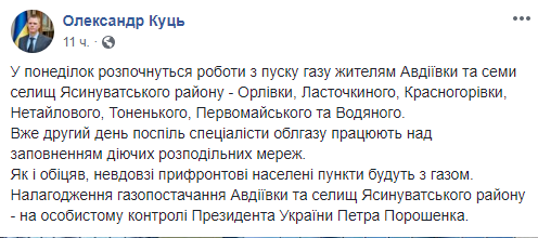 Глава Донецкой областной военно-гражданской администрации Александр Куць сообщил, когда в прифронтовой Авдеевке подключат газоснабжение. Об этом чиновник написал в Facebook.