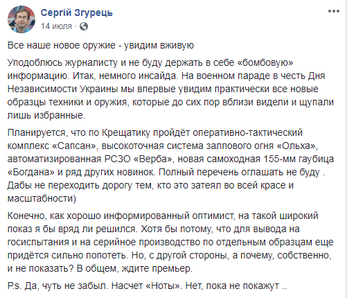 Как сообщил в Facebook директор информационно-консалтинговой компании Defense Express Сергей Згурец, по Крещатику в 2018 году проедутся оперативно-тактический комплекс "Сапсан", высокоточная система залпового огня "Ольха", автоматизированная РСЗО "Верба", новая самоходная 155-мм гаубица "Богдана" и ряд других новинок.