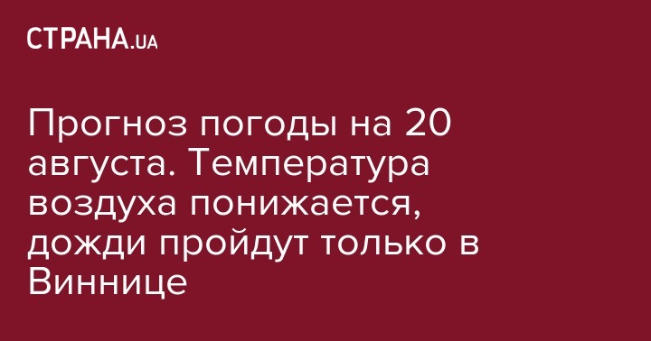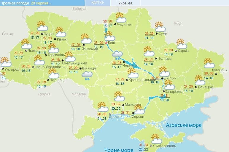 В понедельник, 20 августа, на территории Украины ожидается не такая жаркая, как пару дней назад, но теплая и солнечная погода, днем до +31. Исключение составит Винницкая область, где пройдет небольшой дождь. Об этом сообщает сайт Укргидромецентра.