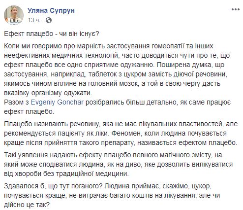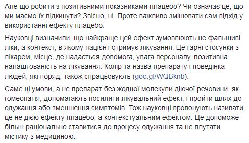 По данным Супрун, еще в 2010 году были проведены исследования, результатом которых стал вывод, что плацебо не имеет значимого клинического эффекта, существует лишь некоторое влияние на симптомы боли и тошноты.