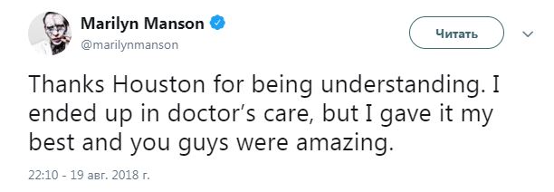 "Спасибо за понимание, Хьюстон. В результате я оказался у врача, но сделал все, что мог, и вы, ребята, были изумительны", — прокомментировал Мэнсон случившееся в Twitter.