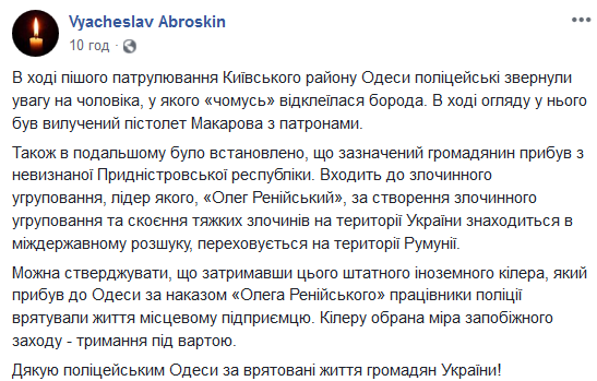 В Одессе патруль полиции задержал наемного киллера из Приднестровья при курьезных обстоятельствах. Об этом сообщил заместитель главы Национальной полиции Украины Вячеслав Аброськин в своем Facebook.