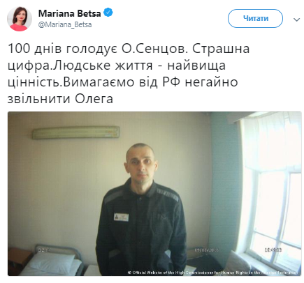Во вторник, 21 августа, исполнилось 100 дней, как в российской колонии голодает украинский политзаключенный Олег Сенцов. Об этом напомнила пресс-секретарь МИД Марьяна Беца в своем микроблоге в Twitter.