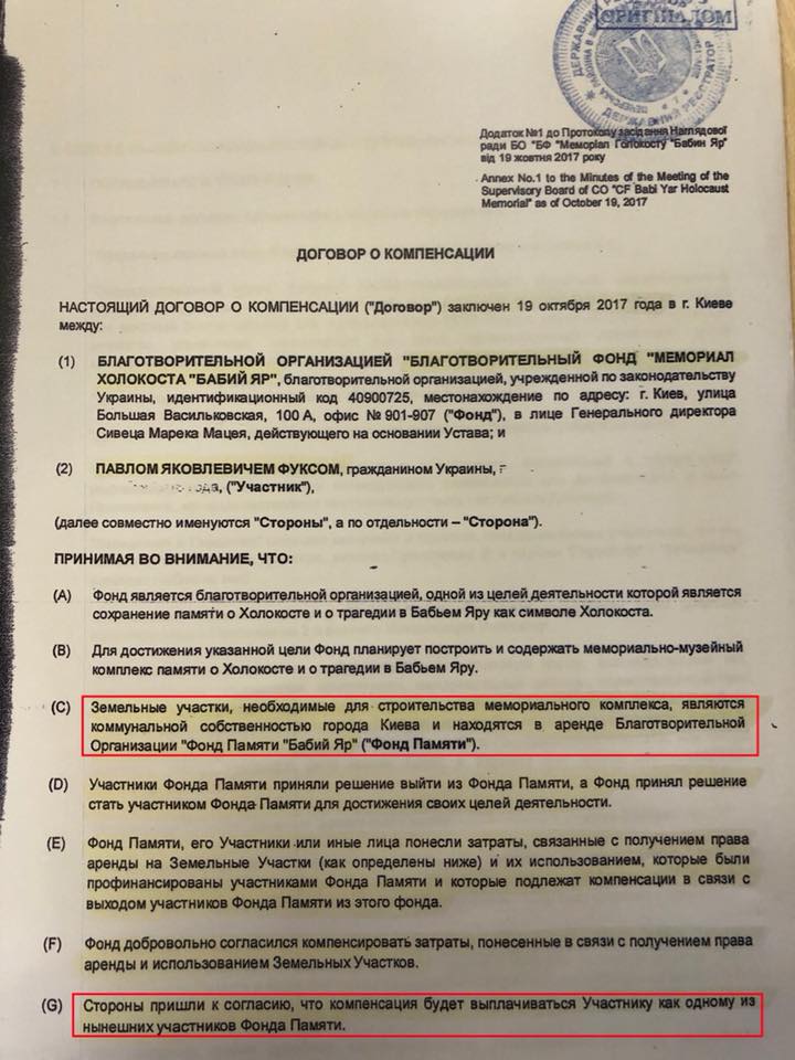 19 октября 2017 состоялось подписание "договора о компенсации" между Фуксом и генеральным директором "Мемориала Холокоста" Бабий Яр", известным польским политиком Мареком Сивецем. Согласно договору, на счета Павла Фукса, для него и его партнеров, должны быть переведены 2 700 000 долларов в гривневом эквиваленте (сейчас примерно 75 млн гривен). В тот же день Фукс обязался выйти из "Фонда памяти" Бабий Яр", а его партнеры (с Рабиновичем включительно) - написать нотариально заверенные заявления об отсутствии каких-либо претензий.