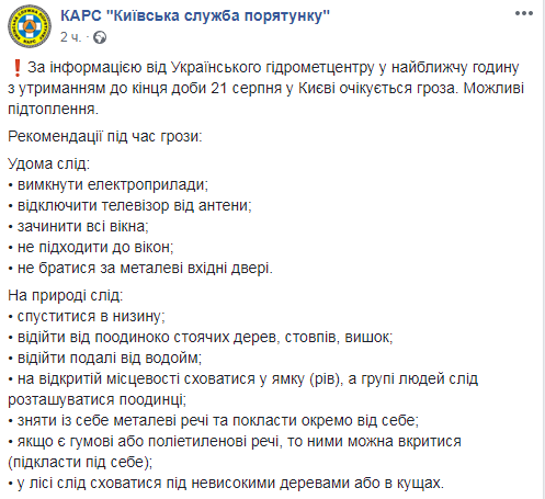В ближайшие часы и до конца суток вторника, 21 августа в Киеве ожидается дождь с грозой. Возможны подтопления. Спасатели напомнили, как действовать во время грозы.