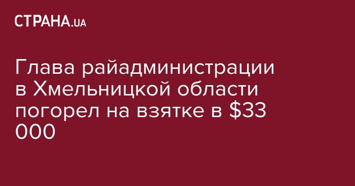 В Хмельницкой области, вчера, 21 августа, глава районной администрации попался на взятке в $33 тысячи. Он был задержан с поличным сотрудниками СБУ и ГПУ, сообщает пресс-служба Генпрокуратуры Украины.