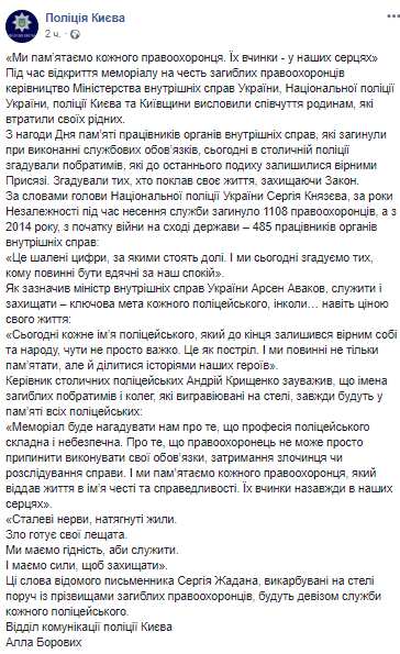 Глава полиции Киева Андрей Крищенко заявил, что мемориал будет напоминать о полицейских,  "отдавших жизнь во имя чести и справедливости.