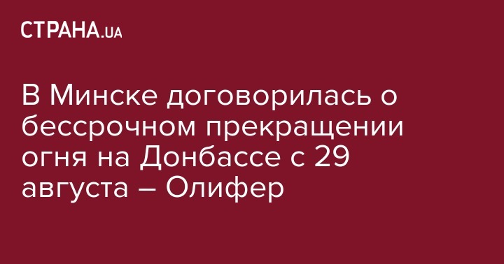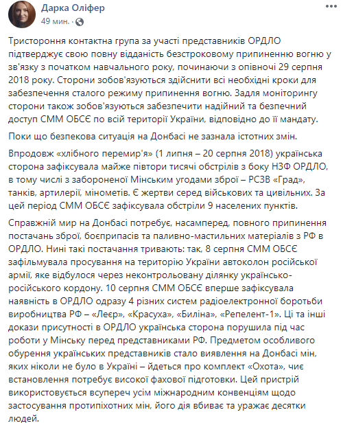 "Трехсторонняя контактная группа при участием представителей отдельных районов Донецкой и Луганской областей подтверждает свою полную приверженность бессрочному прекращению огня в связи с началом учебного года, начиная с полуночи 29 августа 2018 года. Стороны обязуются реализовать все необходимые шаги для обеспечения устойчивого режима прекращения огня", – написала она. По словам Олифер, стороны договорились обеспечивать полный доступ наблюдателям специальной мониторинговой миссии ОБСЕ в соответствии с ее мандатом.