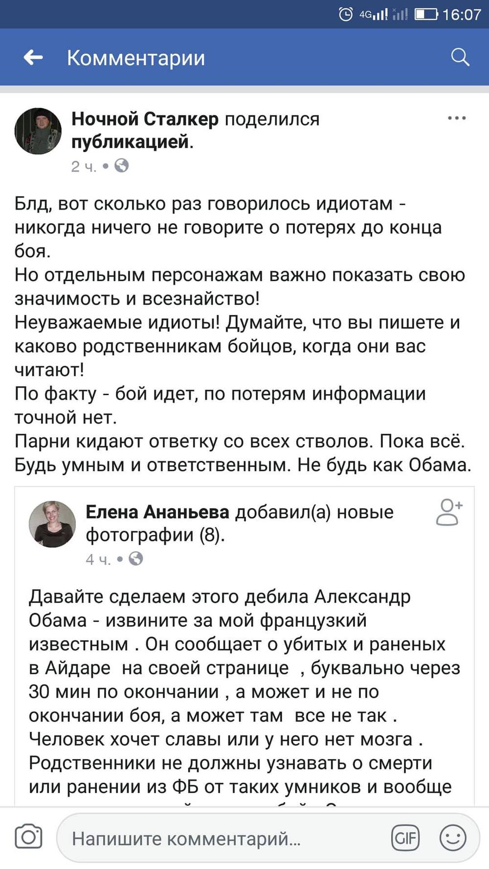 Активист Майдана из Житомира, который в Facebook обозначен как Олександр Обама, еще раньше, чем штаб ООС, рассказал со ссылкой на побратимов из АТО, что основные потери несет батальон "Айдар".