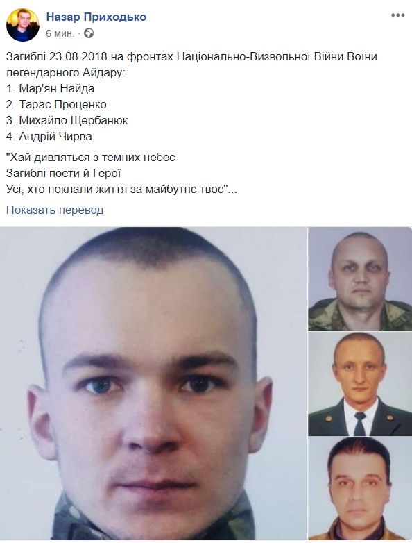 Позже волонтер Назар Приходько назвал имена четырех айдаровцев, которые погибли 23 августа. Это Марьян Найда, Тарас Проценко, Михаил Щербанюк и Андрей Чирва.