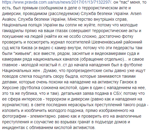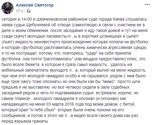 "После заседания я иду такой домой, и тут на меня сзади скачут молодые пасивисты-п...ы в коротких штанишках и сыплют (льют) жидкость неизвестного происхождения, которая попала на футболку, и которая (футболка) расплавилась (очень химически агрессивная среда). Я-то не пострадал. Потому что, повторюсь, "удар" на себя приняла футболка. Она почти "расплавилась" (как вещдок предоставлю) плюс, это было возле бювета, в котором я сразу смыл жидкость", - написал он.