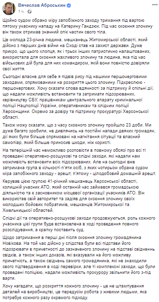 Организатор нападения на херсонская активистку Екатерину Гандзюк под влиянием своего авторитета задействовал для совершения преступления людей, для которых он был командиром во время их участия в боевых действиях на Донбассе. Об этом сообщил в Facebook первый заместитель главы Нацполиции Вячеслав Аброськин.