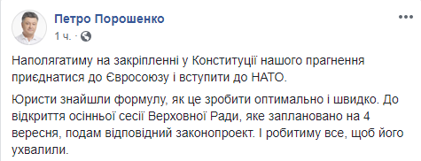 "Юристы нашли формулу, как это сделать оптимально и быстро. До открытия осенней сессии Верховной Рады, которое запланировано на 4 сентября, подам соответствующий законопроект. И буду делать все, чтобы его приняли", - сообщил президент на официальной странице в .